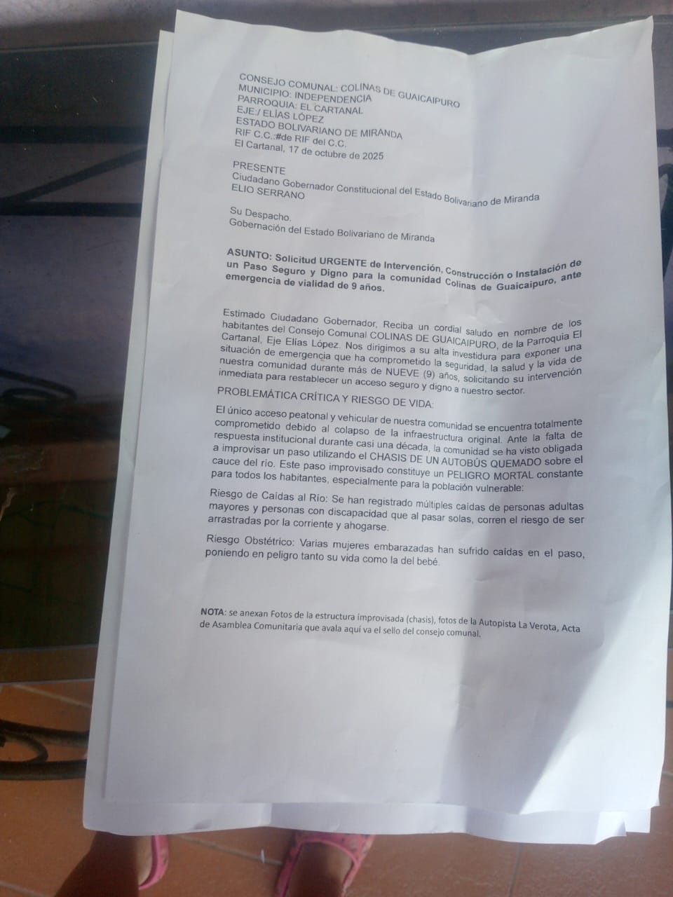 Habitantes de la comunidad Colinas de Guaicaipuro, municipio Independencia, estado Miranda, están solicitando de manera urgente a las autoridades competentes la evaluación técnica y construcción de una pasarela peatonal y vehicular, ante el inminente riesgo que representa el puente improvisado que utilizan desde hace nueve años.