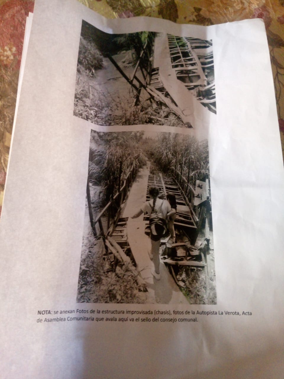 Un vocero comunitario explicó que el paso fue levantado por los propios vecinos con el chasis de un autobús que se incendió en la Autopista Francisco Miranda, como única alternativa para poder cruzar la quebrada que atraviesa el sector. Sin embargo, indicó que la estructura se encuentra seriamente deteriorada y el caudal está a punto de socavarla, lo que podría dejarlos completamente incomunicados.