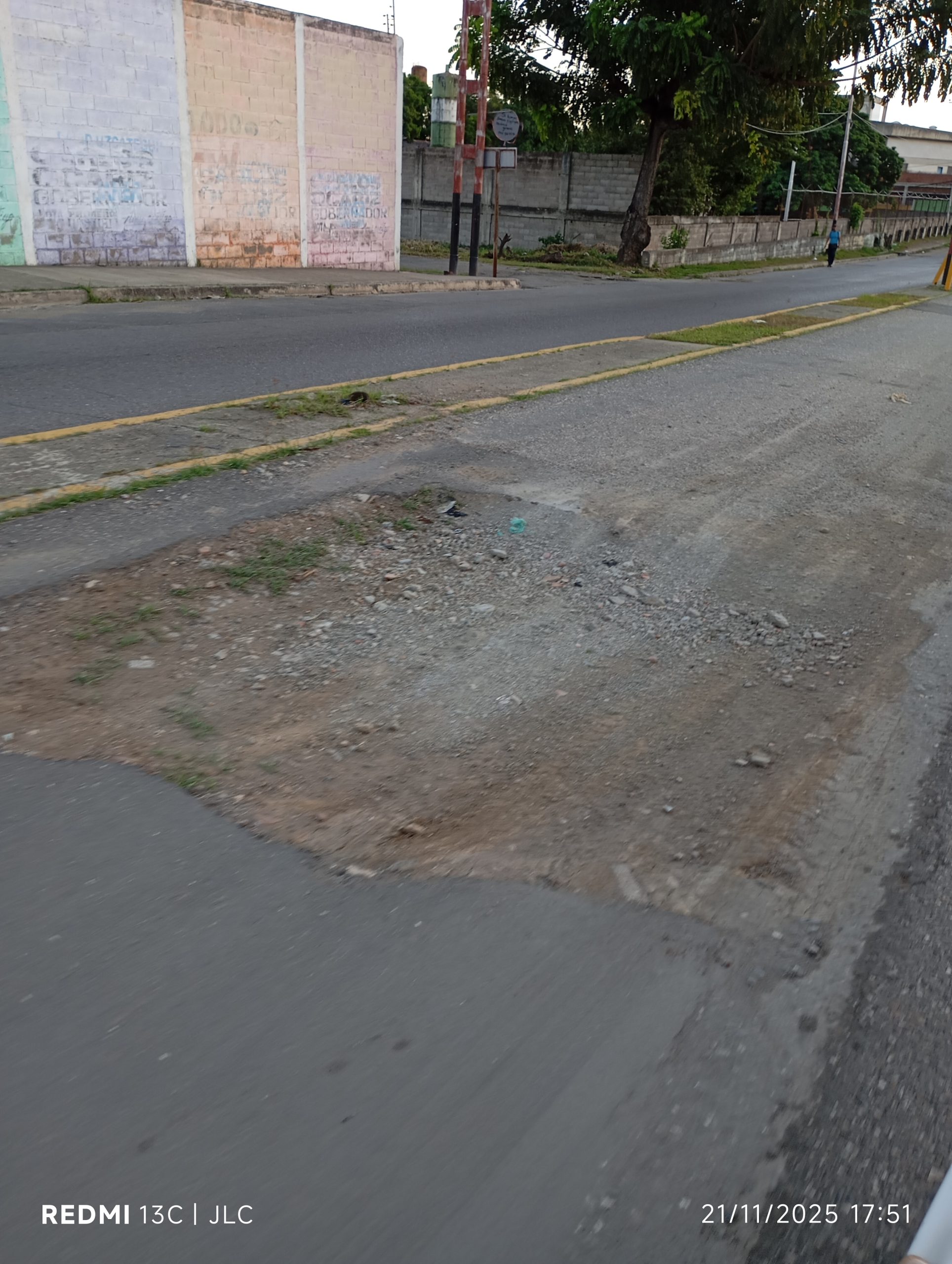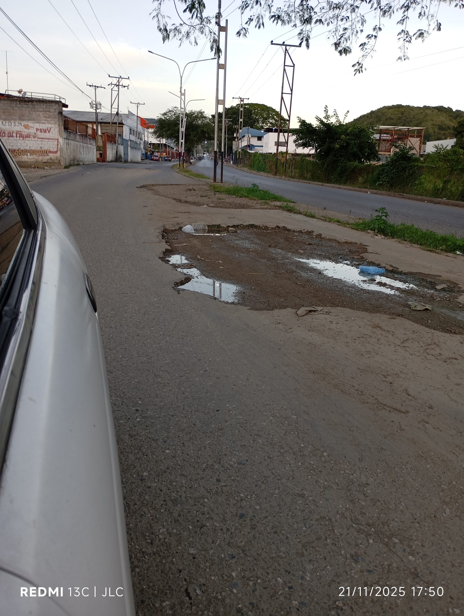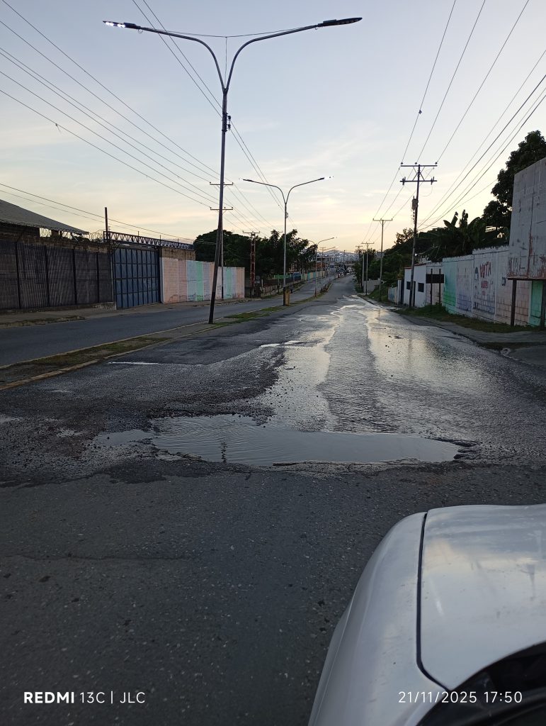 La vía presenta numerosos huecos, algunos de gran tamaño que ya parecen verdaderos cráteres, lo que dificulta seriamente la circulación vehicular y representa un riesgo para conductores y peatones. A esto se suma un considerable bote de agua frente a la Fábrica de Velas, que agrava aún más la situación.