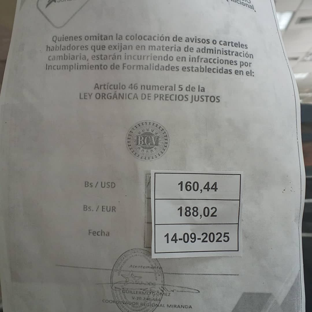 Usuarios del establecimiento comercial Hiper Líder Cúa han manifestado nuevamente su malestar ante presuntas prácticas irregulares en la aplicación de tasas cambiarias. Según reportes, el establecimiento estaría utilizando la tasa del Banco Central de Venezuela (BCV) correspondiente al día martes 13 de septiembre de 2025 que corresponde a Bs. 160.44, en lugar de la tasa vigente al momento de la transacción fijada el dia viernes en Bs. 158.92, lo que resultaría en un perjuicio económico directo para los consumidores.